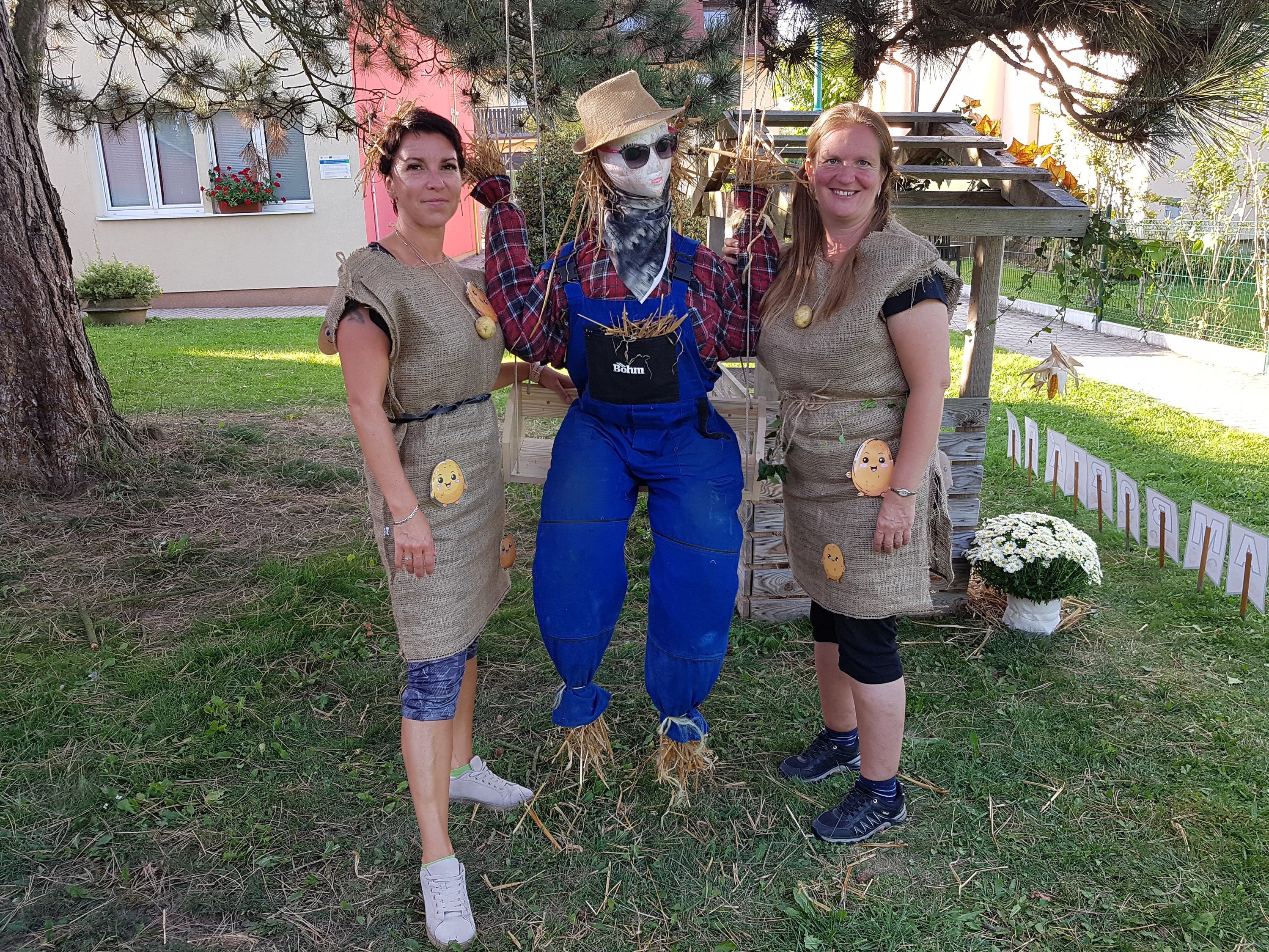 Výroba našeho strašáka ze starého oblečení jako podzimní dekoraci naší zahrady a zároveň i vytvoření slušivých kostýmů z pytlů od brambor na společnou akci s rodiči,, Bramboriádu
