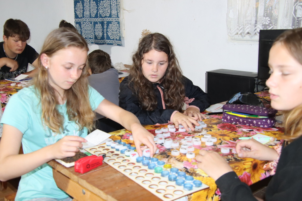 Pomocí vršků a desky, ve které jsou vršky od PET lahví, mohou děti skládat slova a procvičovat, tak i jemnou motoriku