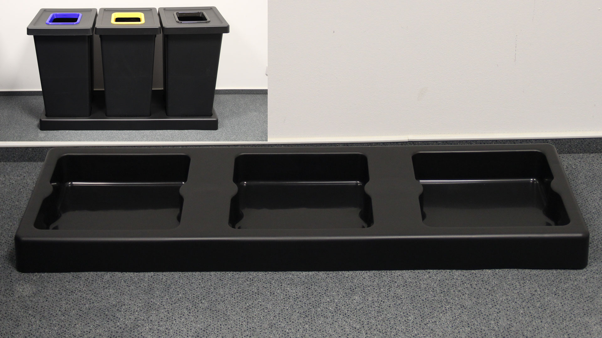 Plastový podstavec pro tři kusy košů o objemu 75 litrů. Při použití více nádob vedle sebe doporučujeme podstavec využít. jeho využití dodá lepší stabilitu a také vypadá třídící hnízdo s jeho využitím lépe. Rozměry základny jsou 119x38cm.